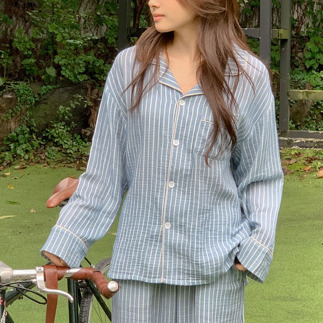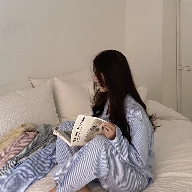 【商品紹介】 清潔感やきちんと感があり、おうち時間の格上げに一役買ってくれるストライプ柄のパジャマ。 線の色合いや間隔にまでこだわっており、キレイなバランスで仕上げられています! 背面にはピンタックも入っているので、後ろ姿もかわいいのが嬉しいポイント♪ ————— 【サイズ・商品詳細】 素材:ポリエステル75%,コットン25% 原産国:中国 TOPS(cm): 胸囲/着丈/肩幅/袖丈/袖幅 Lサイズ:112/65/43/56/23,5 XLサイズ:122/74/50/64/25,5 PANTS(cm): 股上/ウエスト/もも回り/ヒップ/総丈 Lサイズ:30/60/58/106/97 XLサイズ:34/66/60/114/99 ※ウエストはゴム仕様のため、幅がございます。 ※測定の方法により、若干サイズに誤差が生じる場合がございます。ご了承くださいませ。 ※洗濯機を使用の際には、上下ともにネットに入れてください。 ※縮む可能性がございますので、乾燥機の使用はお控えください。 【JUUNEEDU】 韓国にある店舗は、日本人から韓国旅行で行くべきスポットとして今注目のパジャマブランド「juuneedu」。 2021年に韓国でスタートし、どんな瞬間も可愛いくいたい女性のため、快適で上質なパジャマを提供している。メンズも着られるカップルパジャマも充実。