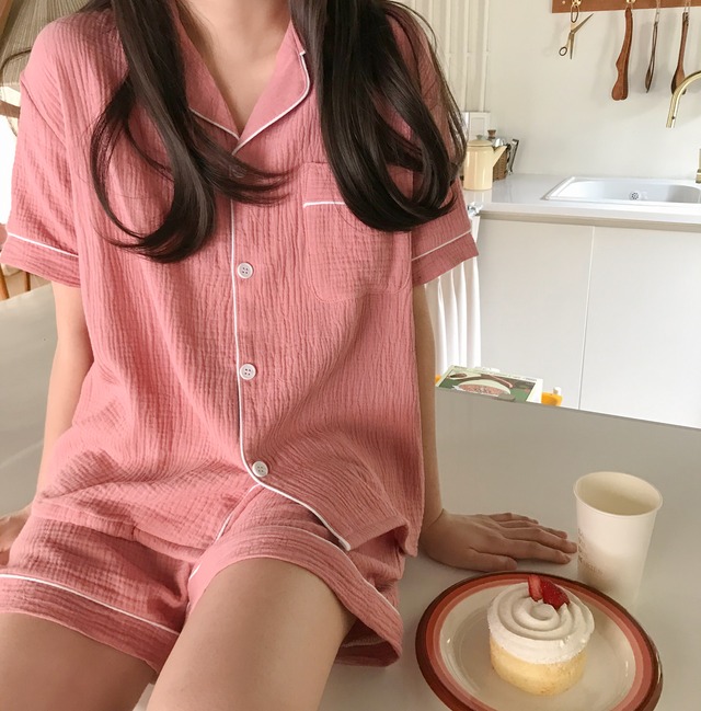 【商品紹介】 大人気の7dayspajamaの半袖が登場?各カラーの優しい色合いと白のパイピングのコントラストが可愛く、シンプルだけど絶妙なカラーリングが人気の理由!友達や恋人と一緒にお気にいりの色を是非見つけてみてくださいね…? 【サイズ・商品詳細】 素材:コットン100% 原産国:中国 TOPS: 胸囲/着丈/肩幅/袖丈/袖幅 Lサイズ:112/63/46/20/24 XLサイズ:118/70/54/21/26,5 PANTS: 股上/ウエスト/もも回り/ヒップ/総丈 Lサイズ:33/60/60/104/39 XLサイズ:41/64/64/112/51 ※ウエストはゴム仕様のため、幅がございます。 ※測定の方法により、若干サイズに誤差が生じる場合がございます。ご了承くださいませ。 ※洗濯機を使用の際には、上下ともにネットに入れてください。 ※縮む可能性がございますので、乾燥機の使用はお控えください。 【JUUNEEDU】 韓国にある店舗は、日本人から韓国旅行で行くべきスポットとして今注目のパジャマブランド「juuneedu」。2021年に韓国でスタートし、どんな瞬間も可愛いくいたい女性のため、快適で上質なパジャマを提供している。メンズも着られるカップルパジャマも充実。