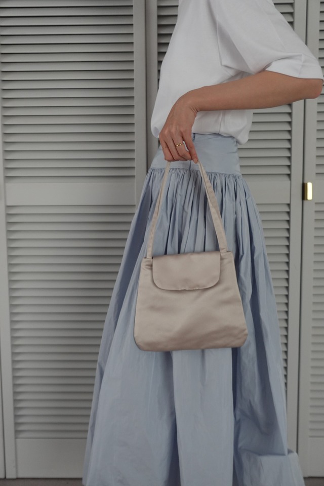 【商品紹介】 可愛らしいフォルムのAlice bag?フラップ部分にはマグネットボタンもついていて、しっかり留められる仕様に。他のアイテム同様、艶のあるサテン生地を使用しているので普段使いはもちろん、パーティーなどの綺麗めなコーディネートにも相性◎ 【サイズ・商品詳細】 素材:ポリエステルサテン 原産国:カナダ サイズ:高さ22cm/幅23.5cm/持ち50.5cm 【A Bronze Age】 2016年にカナダにて設立された”シーズンレス・トレンドレスで長く愛用できる作品”をテーマに現代的なライフスタイルブランドを展開する「ブロンズエイジ」。現代女性の日常に寄り添う高品質でフェミニンなアイテムは、地元の製造業と共に一点一点手作業で作られています。