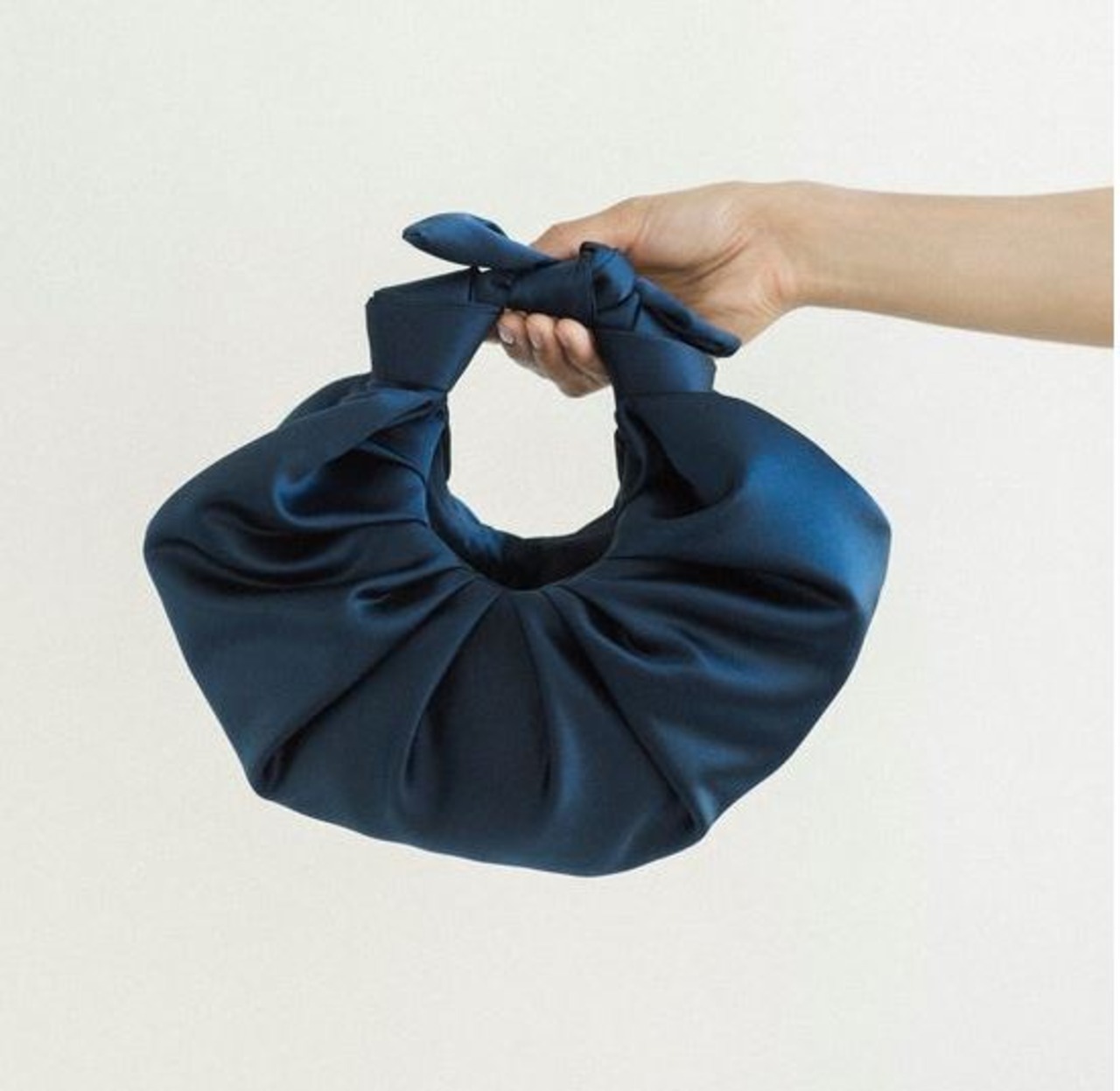 日本の風呂敷技術からインスピレーションを受けて作られた、クロワッサンのようなフォルムのハンドバッグ。艶のあるサテン素材を使用したバッグはデイリーにもオケージョンにも、オールシーズン、様々なスタイリングに合わせていただけます。ハンドル部分は結び目を調整することで肩掛けも可能◎