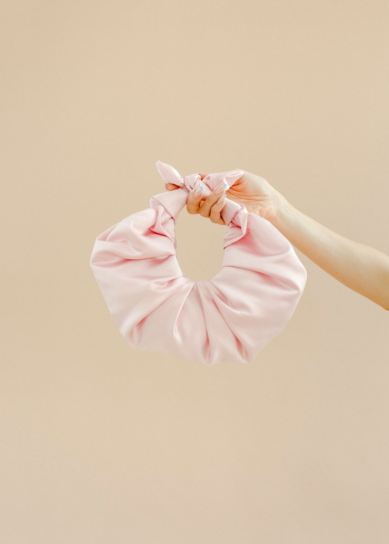 日本の風呂敷技術からインスピレーションを受けて作られた、クロワッサンのようなフォルムのハンドバッグ。艶のあるサテン素材を使用したバッグはデイリーにもオケージョンにも、オールシーズン、様々なスタイリングに合わせていただけます。ハンドル部分は結び目を調整することで肩掛けも可能◎