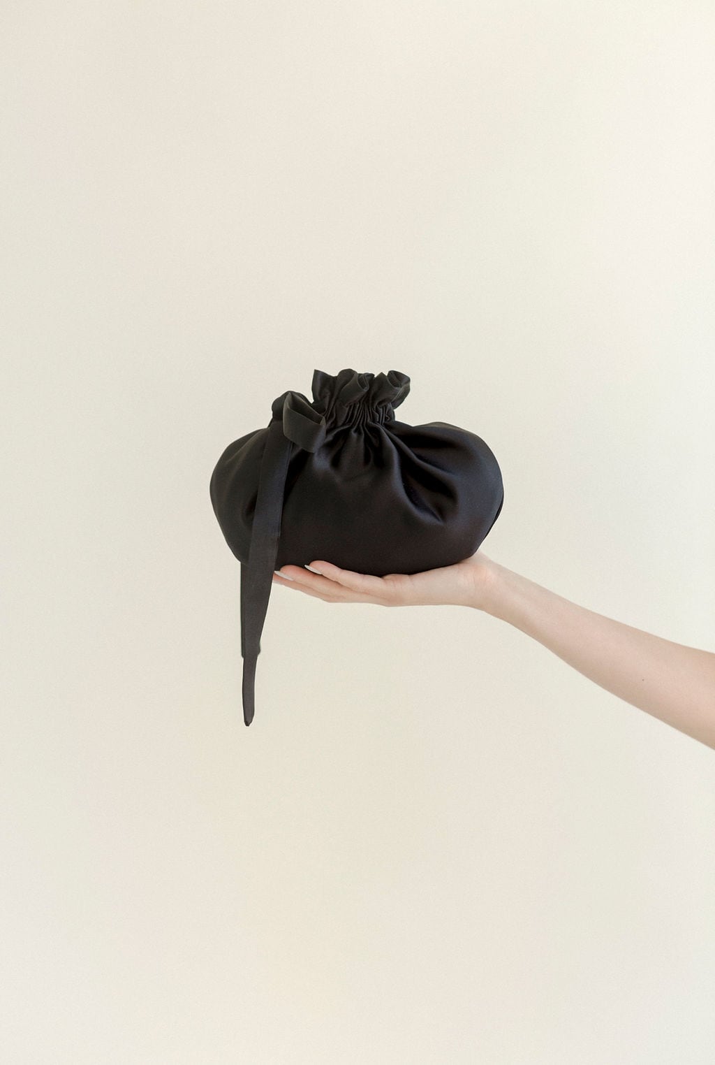 コロンとしたフォルムが可愛いポーチ。艶のあるサテン素材を使用したこのアイテムは全4色で展開。ポーチとしてだけでなく、結び目を変えてミニバッグとしても使える2WAY仕様です。