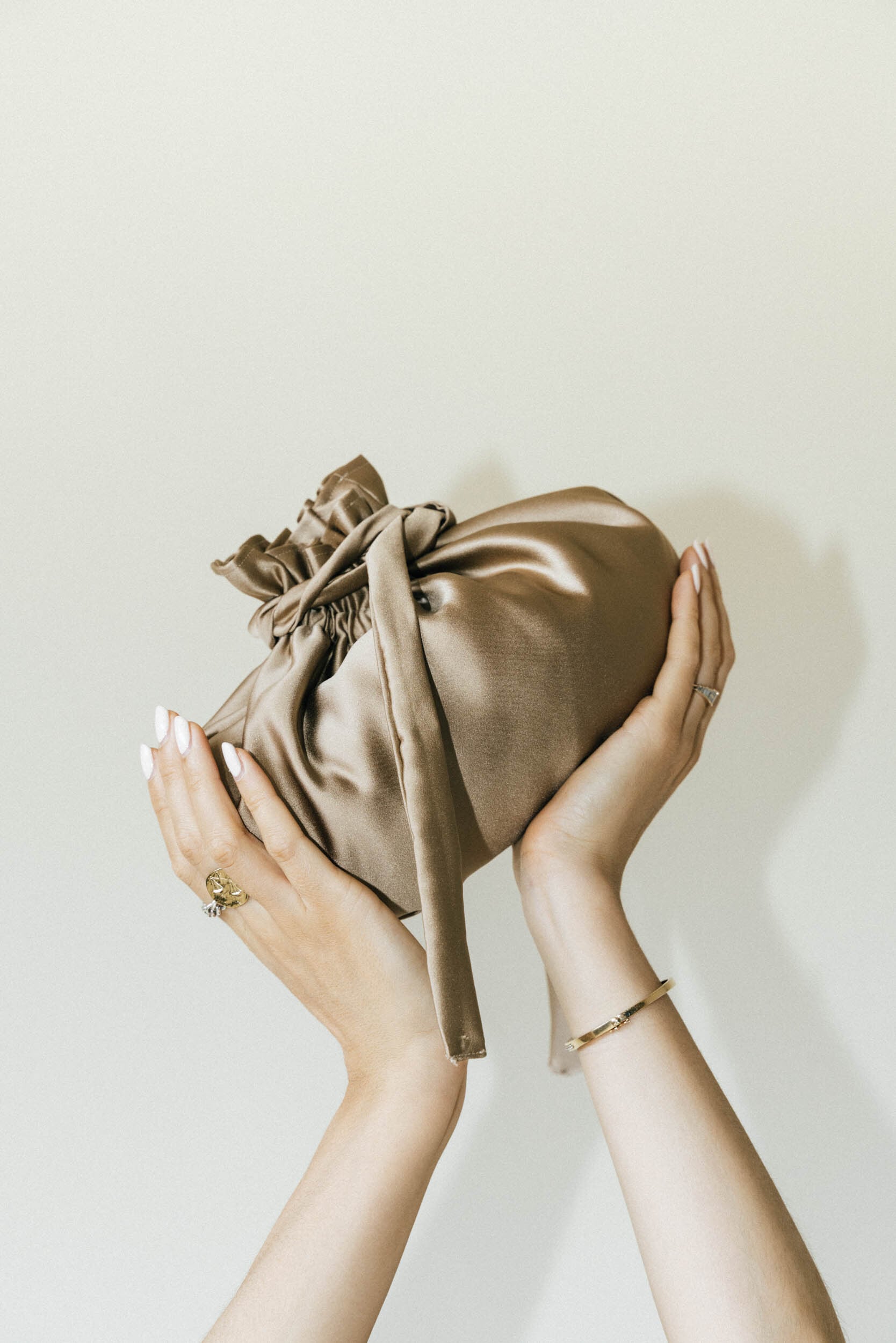 コロンとしたフォルムが可愛いポーチ。艶のあるサテン素材を使用したこのアイテムは全4色で展開。ポーチとしてだけでなく、結び目を変えてミニバッグとしても使える2WAY仕様です。