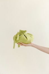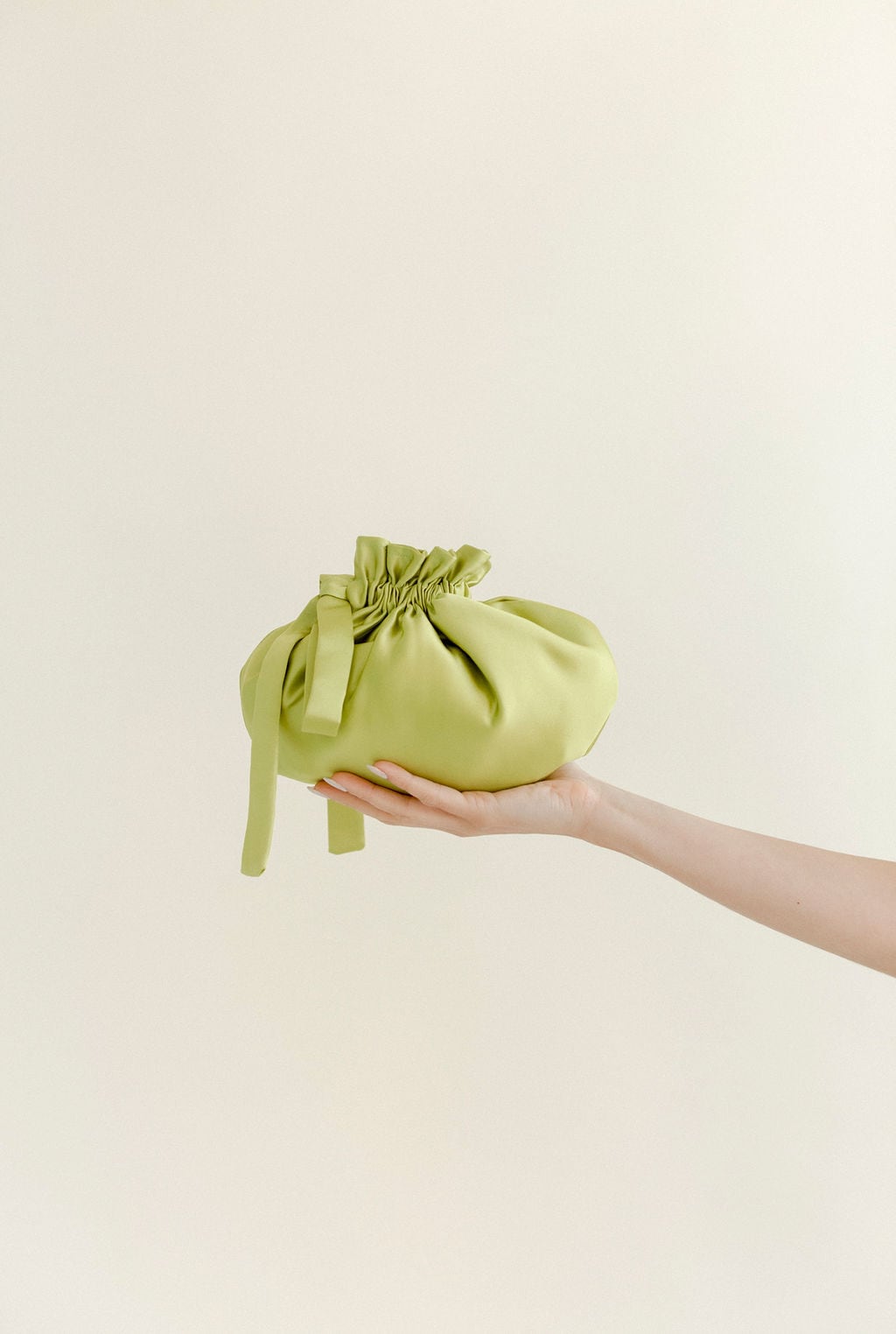 コロンとしたフォルムが可愛いポーチ。艶のあるサテン素材を使用したこのアイテムは全4色で展開。ポーチとしてだけでなく、結び目を変えてミニバッグとしても使える2WAY仕様です。