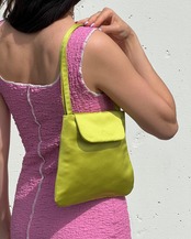 可愛らしいフォルムのAlice bag?フラップ部分にはマグネットボタンもついていて、しっかり留められる仕様に。他のアイテム同様、艶のあるサテン生地を使用しているので普段使いはもちろん、パーティーなどの綺麗めなコーディネートにも相性◎