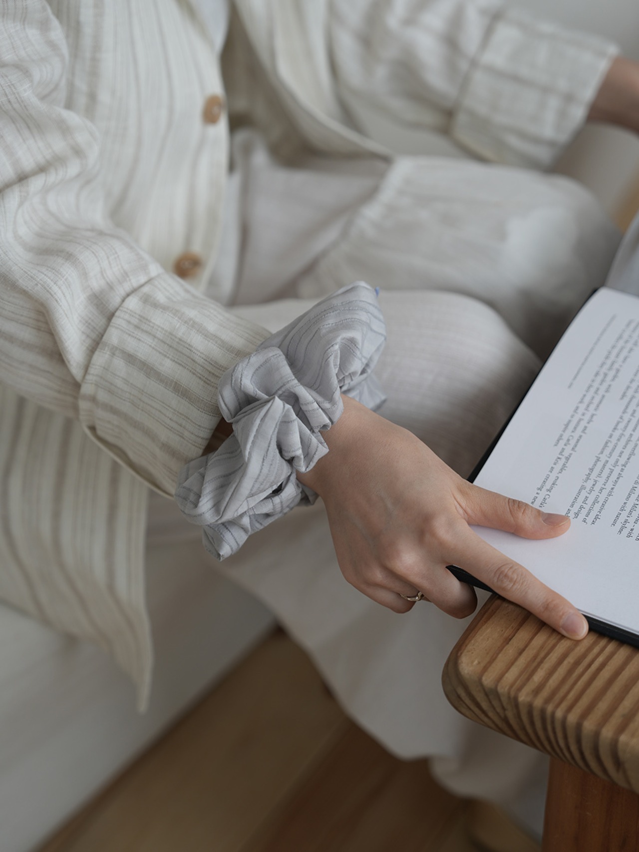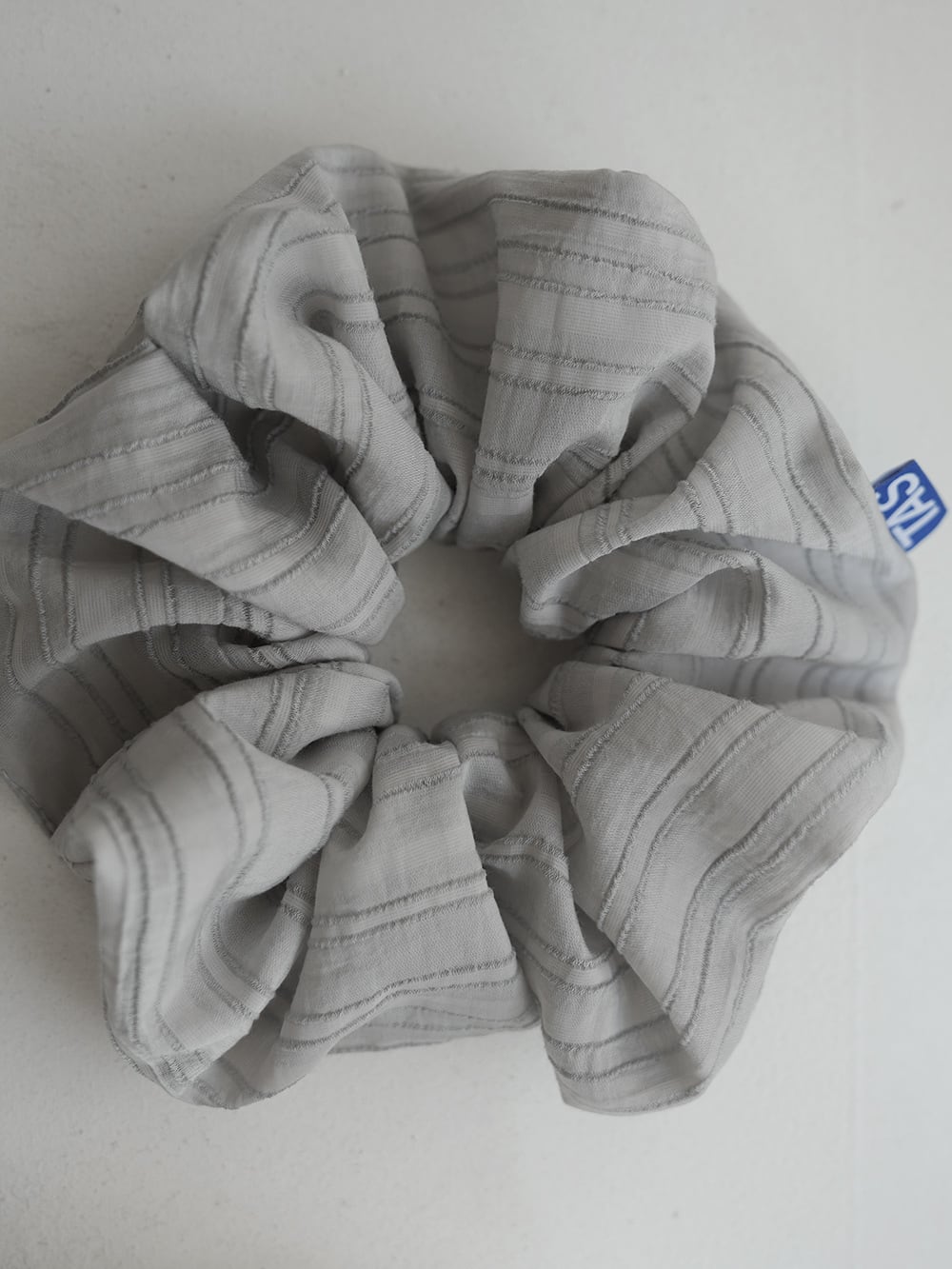 グレー×ホワイトストライプのパターンとナチュラルな素材感がかわいいシュシュ。