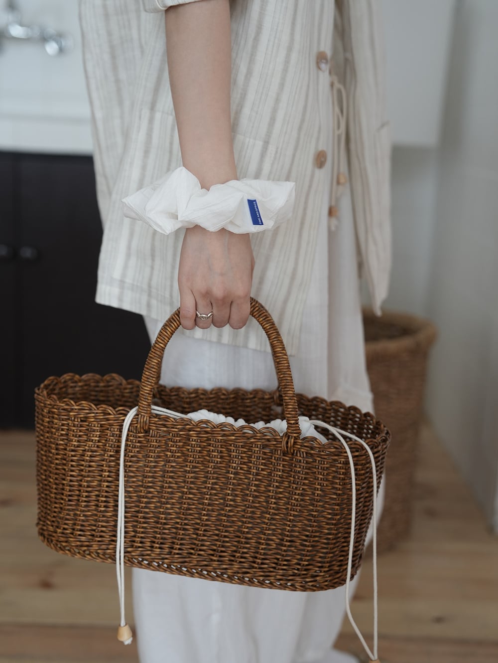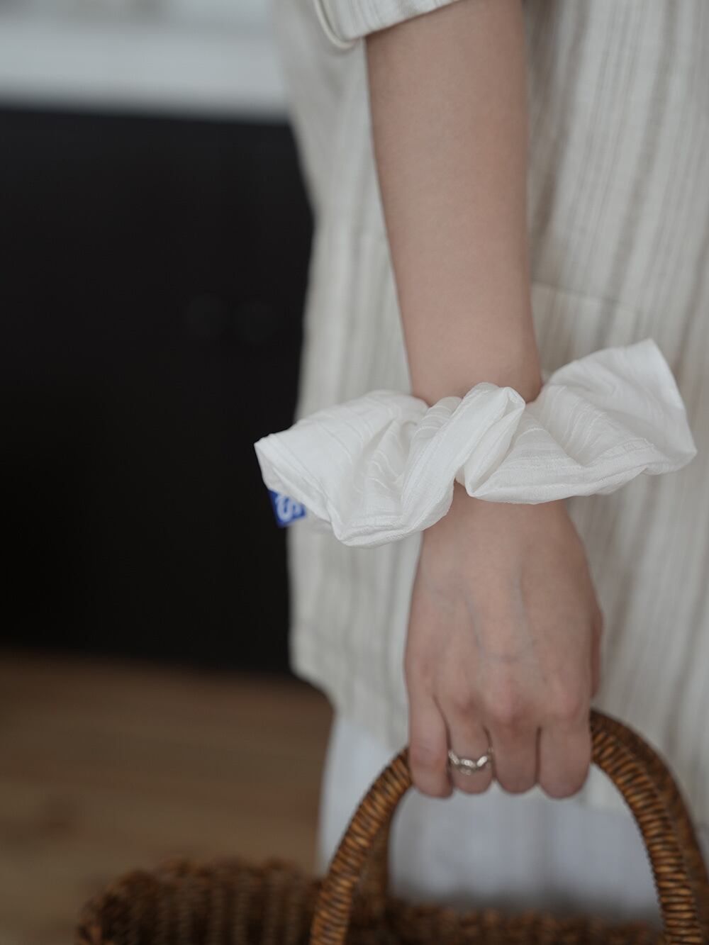細いストライプパターンとナチュラルな素材感がかわいいシュシュ。