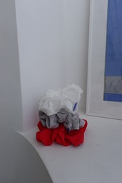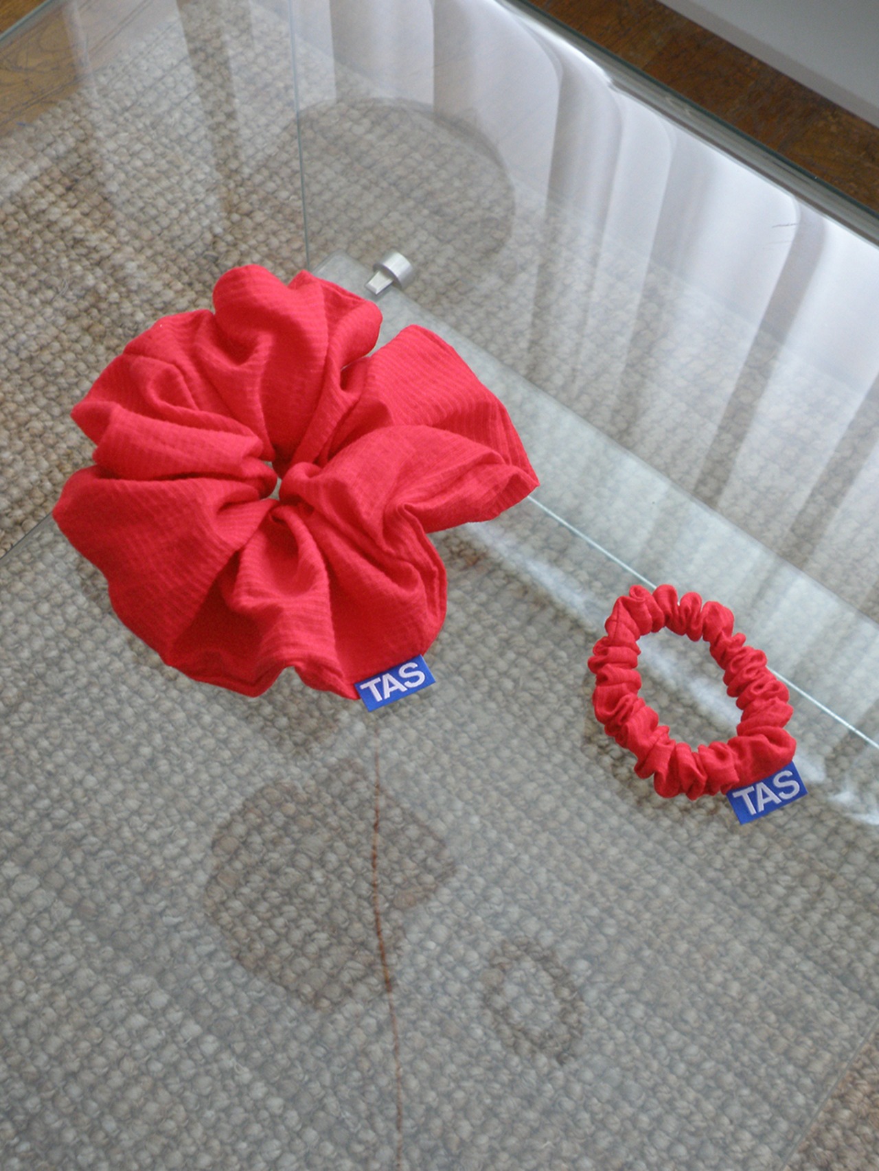 細いストライプパターンとナチュラルな素材感がかわいいシュシュ。