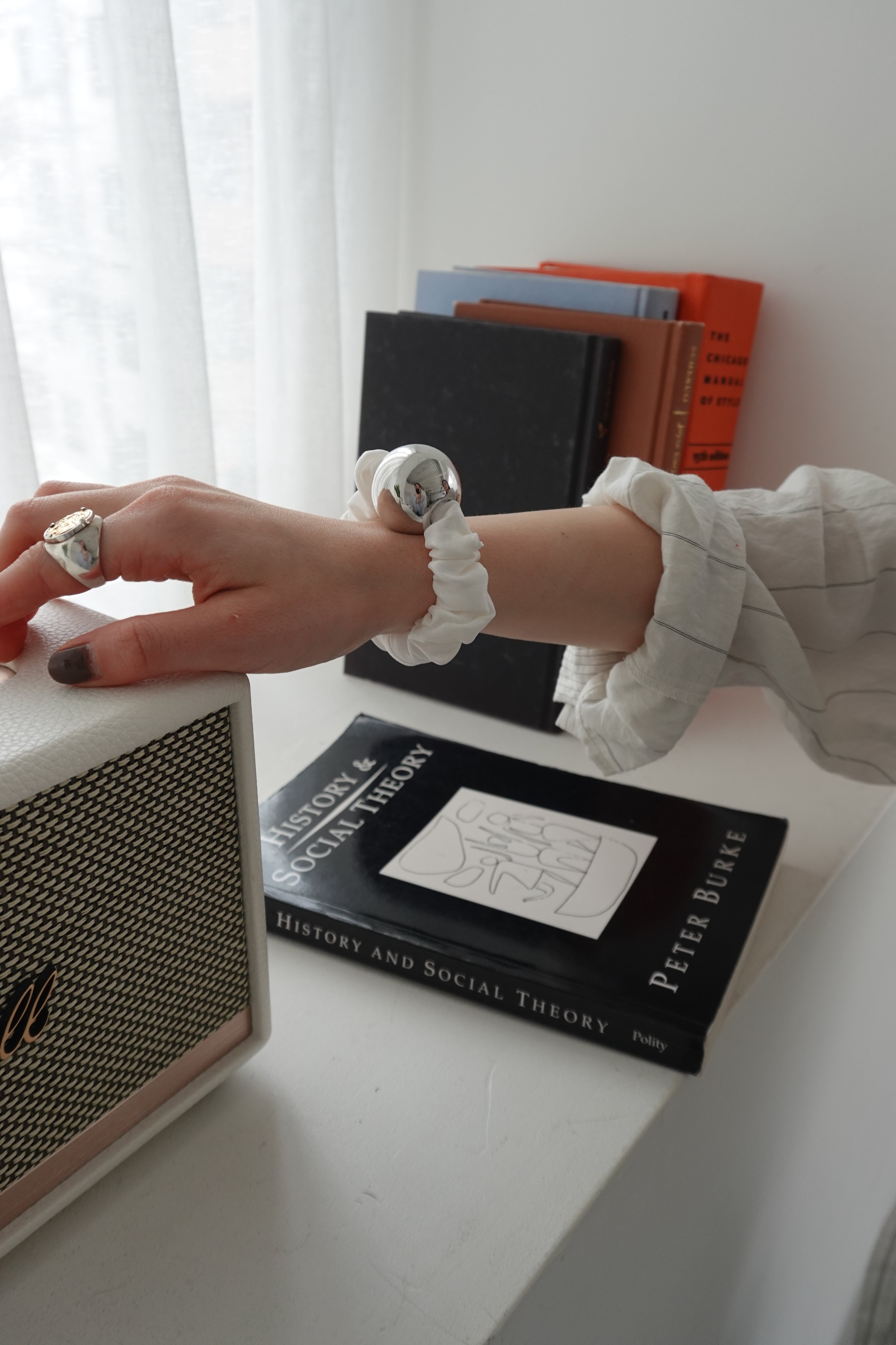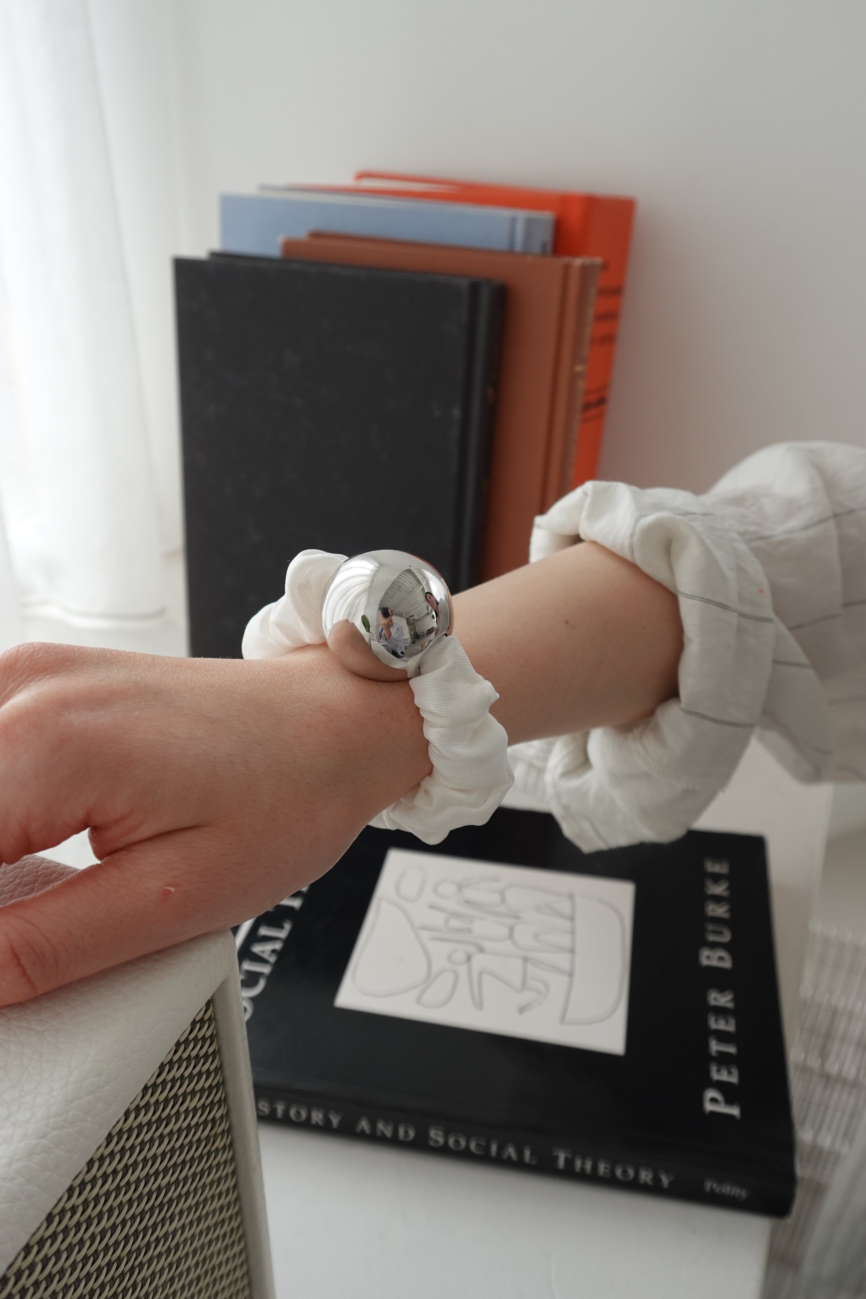 Medium Metal Ball Silk Scrunchie/ white
