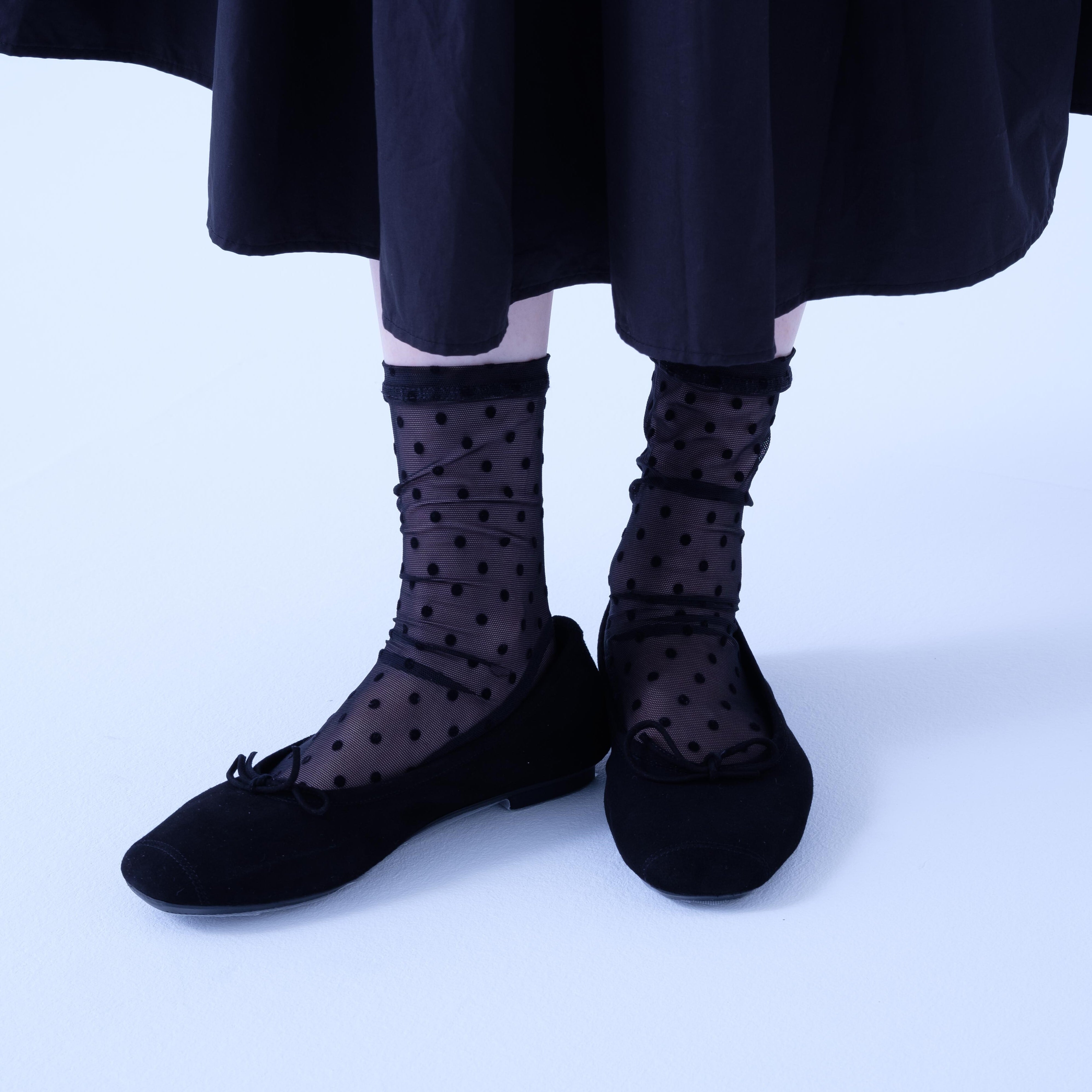 黒いモコモコしたベルベット生地のドット柄が特徴。脚をエレガントに見せてくれるアイテムです♪